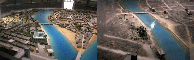 左が原爆投下前、右が投下後の街並みの模型ですが、本当に何も無くなって しまった様子が分かります。