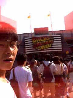 ユニバーサルスタジオへのバスの途中、デジタルハリウッド杉山校長から 「絶対行かなきゃいけないライドものはコレ」だの、「コレはどこどこの席に 座ると一番楽しめる」だのとお達しがあり(笑) まずは絶対乗らなきゃいけない「バック トゥ ザ フューチャー」へ。